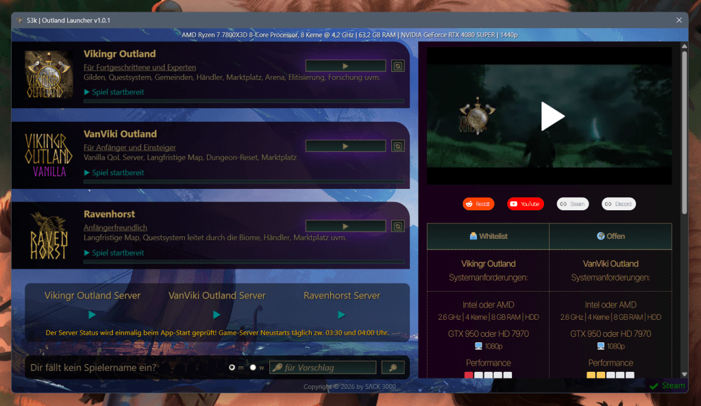 - Lade Dir den aktuellen Outland Launcher aus dem Discord. Starte ihn und gib einmalig den Validierungscode aus dem Discord in das Textfeld ein.